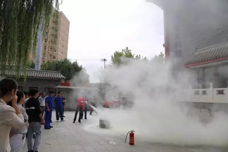 本次演练通过模拟实际场景,分火灾报警、应急疏散、楼前灭火三个部分。万发胜队长总结了四个要领:提瓶、拔销、对根、压柄。