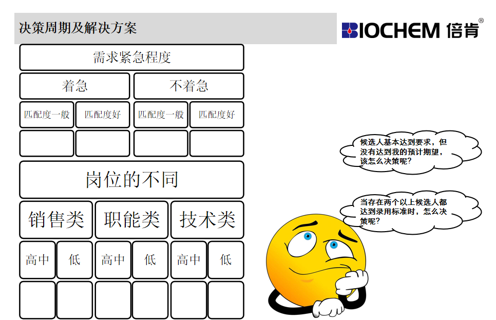 除了理论知识的学习外,当然也少不了案例分析、互动研讨和答疑解惑等,促进学员们积极思考。体外诊断事业部金晶现场提出了一个经常困扰她的问题:当存在两个以上候选人都达到录用标准时如何决策,一位性格外向易沟通但工作能力平常,另一位性格外向不易沟通但工作能力极强。主讲人通过需求紧急程度给予了决策周期和解决方案,需求紧急程度较低时建议选择匹配度更好的候选人。