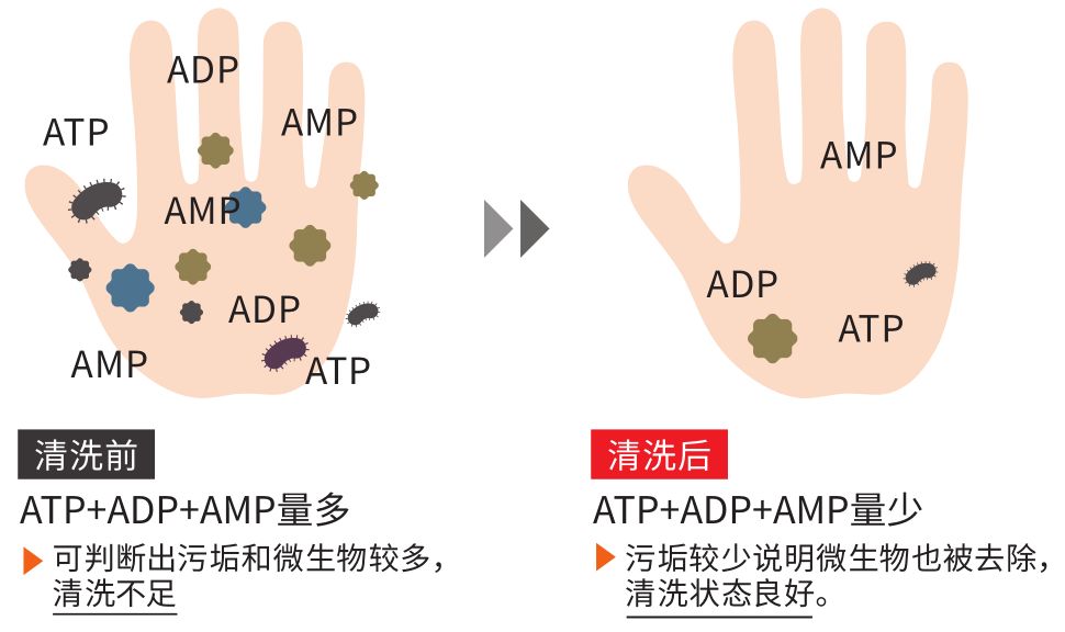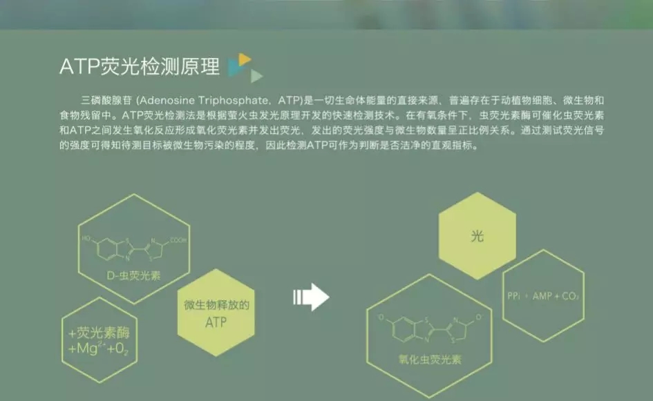 在微生物中,往往会含有ATP(三磷酸腺苷)这种物质、也会含有它的分解产物ADP(二磷酸腺苷)、AMP(一磷酸腺苷)。ATP荧光检测法通过检测残留微生物中的ATP含量,从而准确判断其洁净度。
