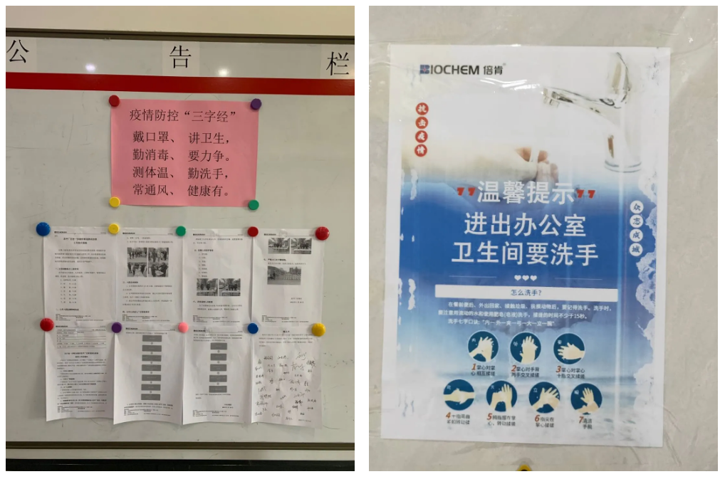 设立疫情公告栏、张贴宣传标语,签订疫情防控责任书,加强外来人员管理。统筹疫情防控物资储备,将口罩、电子体温计、医用酒精、84消毒液、护目镜、特殊防护服、喷壶等防疫物资及时分发到永丰和昌平办公区,确保防控物资的正常使用。