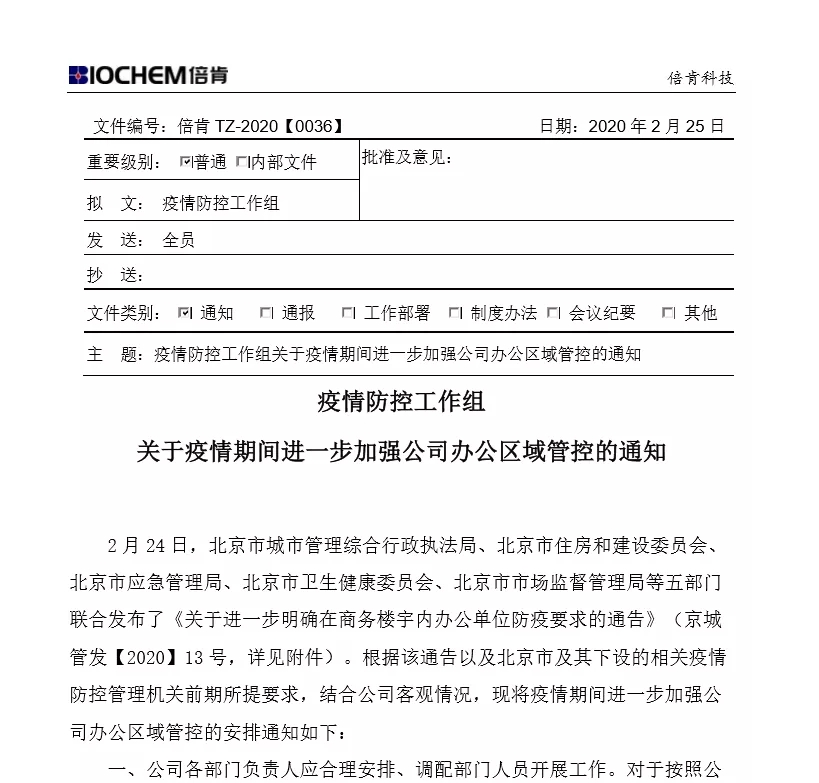 为保障安全有序复工复产,进一步落实北京市城市管理综合行政执法局、北京市住房和建设委员会、北京市应急管理局、北京市卫生健康委员会和北京市市场监督管理局联合发布的《关于进一步明确在商务楼宇内办公单位防疫要求的通告》,倍肯科技疫情防控工作组发布了《关于疫情期间进一步加强公司办公区域管控的通知》,通过采取系列防控措施,持续加强疫情期间公司办公区域的管控工作。